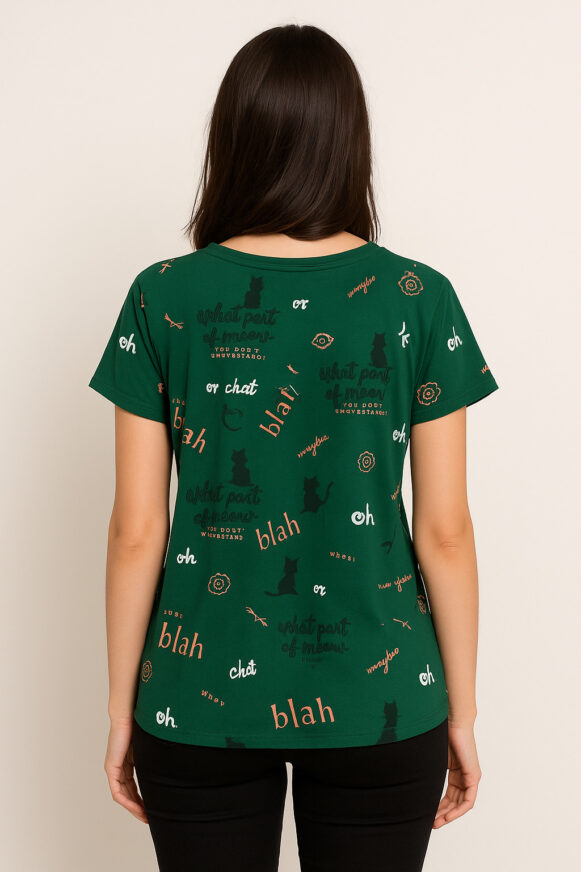 Green Cat Print Slogan T-Shirt, Emerald green cotton T-shirt with playful slogan print and cat motifs. Features short sleeves, round neck, and relaxed fit.