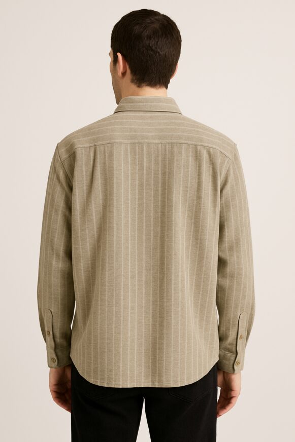 Rent for ₹50.00/day (Buy for ₹149.00)Men’s Light Grey Cotton Blend Shirt, "Stylish olive green button-down shirt crafted from soft textured fabric with subtle blue and red vertical stripes. Featuring a button-down collar, full sleeves with cuffs, and a tailored fit, this versatile shirt combines classic charm with modern elegance — ideal for both work and casual wear."