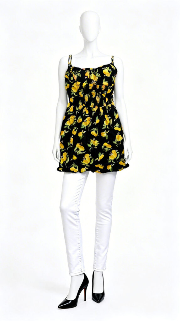 For younger women or those who love a bolder, more playful Easter look, the Lemon Print Sleeveless Mini Dress brings a burst of cheerful energy. The lemon print feels seasonally fresh and vibrant, and the sleeveless mini silhouette is light and comfortable. Pair it with white sneakers or block-heeled sandals for a look that is fun and stylish.
