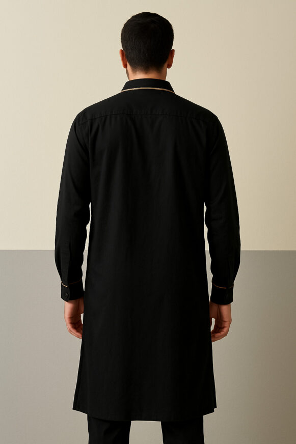 Black Kurta Full Sleeve, Black cotton-blend kurta with golden piping detail, mandarin collar, and full sleeves – tailored for comfort and elegance