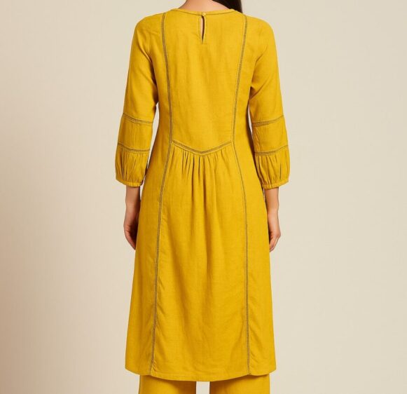 Mustard Yellow Cotton Kurta, Mustard yellow cotton kurta with 3/4th sleeves, pin-tuck front, ladder lace detailing, and wide-legged matching palazzos.
