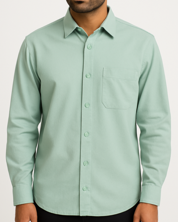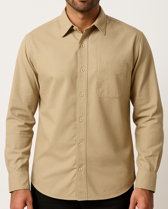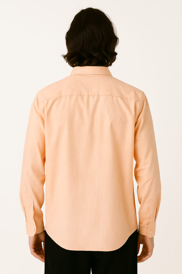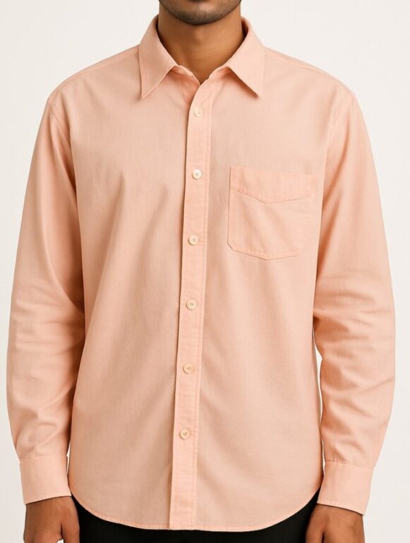 Classic Peach Shirt, Men’s classic peach cotton shirt with a point collar, front pocket, and button-down front. Relaxed fit with curved hem and full sleeves.