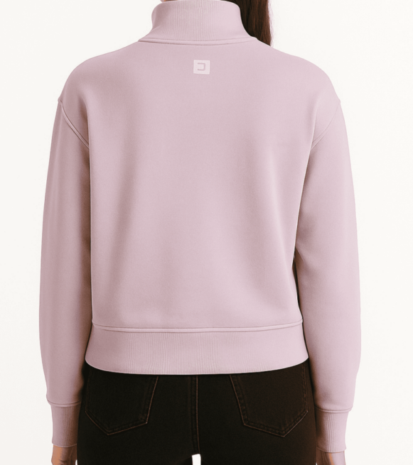 Pastel Lavender Zip-Neck, Soft cotton zip-neck sweatshirt in pastel lavender, featuring a high collar, ribbed cuffs and hem, relaxed boxy fit, and a minimalist back logo.
