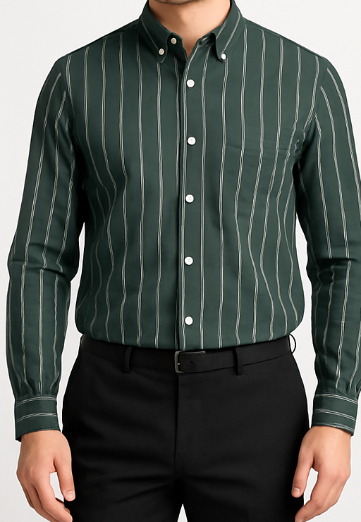 Hunter Green Striped Shirt, Men’s hunter green cotton shirt with white vertical stripes, button-down collar, and front pocket – perfect for semi-formal occasions.