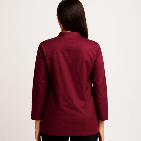 Maroon Mandarin Cotton Shirt, Women's full-sleeve maroon cotton shirt with mandarin collar and hidden button placket.