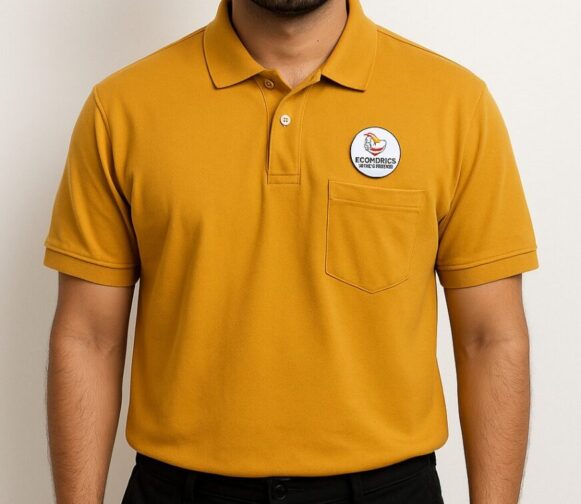 Rent for ₹50.00/day (Buy for ₹149.00)Mustard Yellow Polo T-Shirt with Ecomdrics Badge, Mustard yellow polo t-shirt with pocket, short sleeves, and Ecomdrics branding – comfortable and stylish cotton wear for men. Designed with short sleeves and a classic polo collar, the shirt maintains a clean, structured look suitable for both casual and smart-casual settings. A neatly stitched chest pocket adds practical detail, while the Ecomdrics badge introduces a signature branded touch that enhances its modern appeal. The fabric is built for regular wear, holding its shape and color even after repeated washing.
