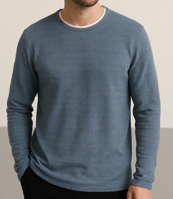 Textured Blue Crew Neck T-Shirt, A stylish long sleeve crew neck t-shirt in textured blue cotton-blend fabric, offering comfort and versatility for any casual outfit.
