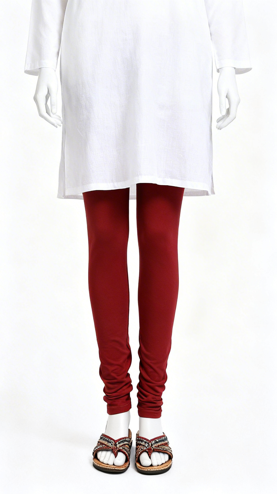 Comfortable deep red stretch leggings with elastic waistband, ideal for daily wear and pairing with kurtis or tunics.