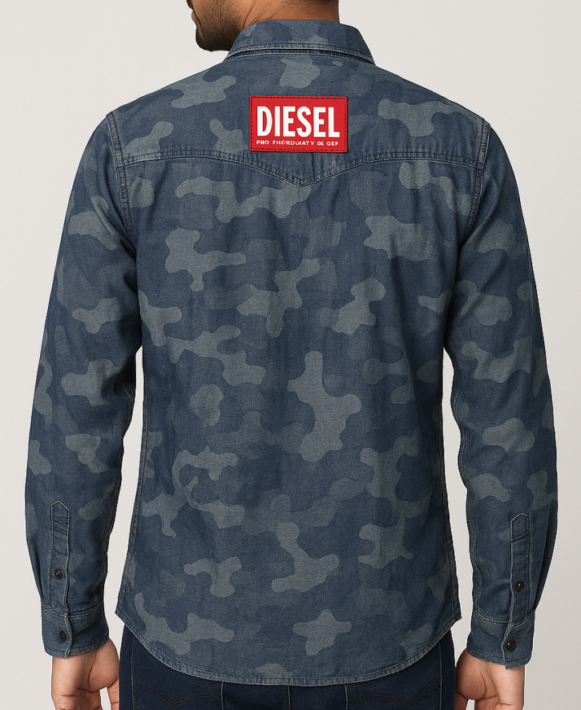 Men’s Gray Graphic Patches shirt, Limited-edition Diesel denim shirt in blue camo with Money Heist Denver and Dalí mask patches, front and back branding, and dual chest pockets.