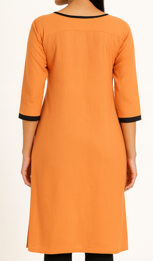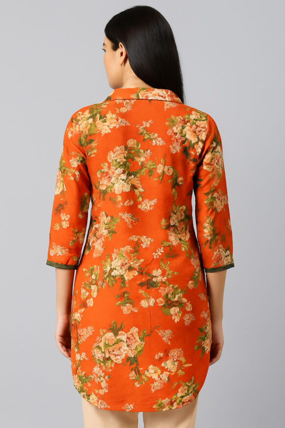 Orange Floral Shirt Kurta, Bright orange straight-fit kurta with shirt collar, floral print, and 3/4 sleeves. Elegant and comfortable for daily or festive casuals.