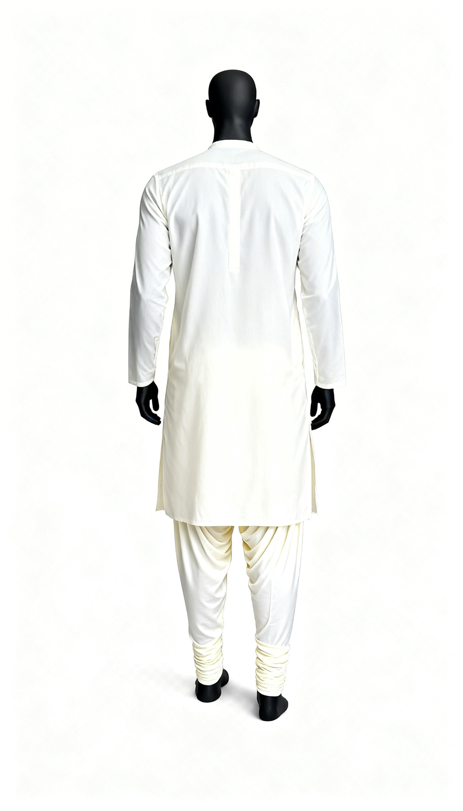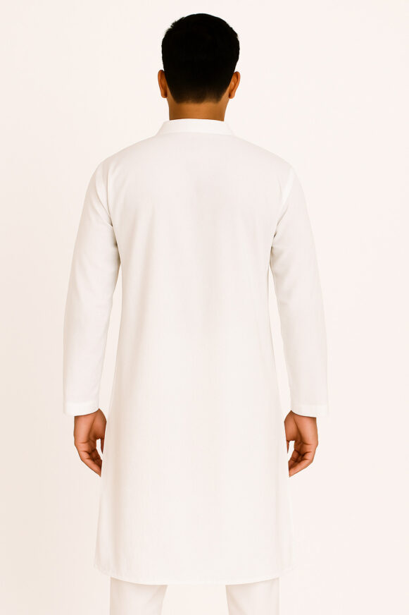 Rent for ₹100.00/day (Buy for ₹399.00)White Kurta Pajama, A timeless white cotton kurta pajama set featuring a mandarin collar, full sleeves, half-button placket, and a straight-cut silhouette. Completed with matching pajama pants, it offers breathable comfort and elegant style for festivals, religious functions, or casual ethnic outings.