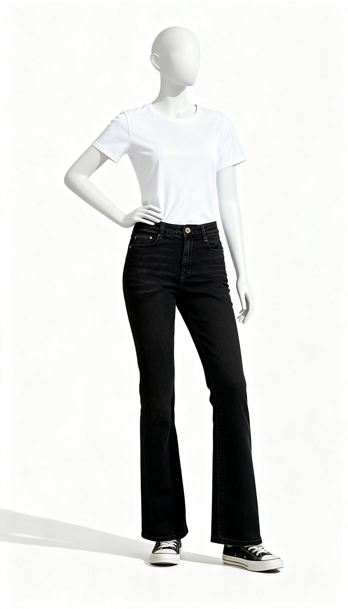 A black solid bootcut fit jeans featuring a flared silhouette and raw frayed hems for casual styling.