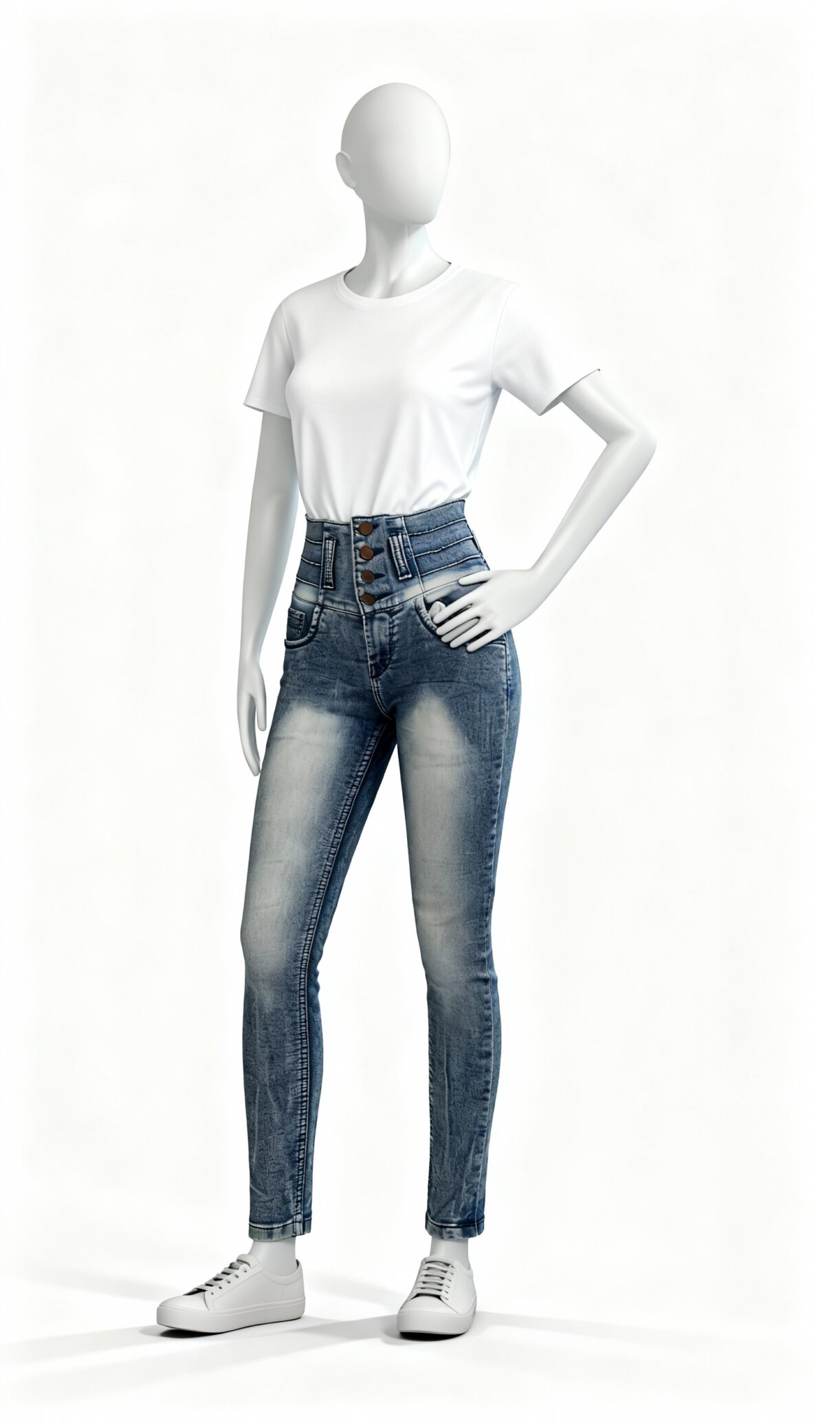High-waist washed denim jeans featuring multi-button closure and a slim-tapered silhouette.