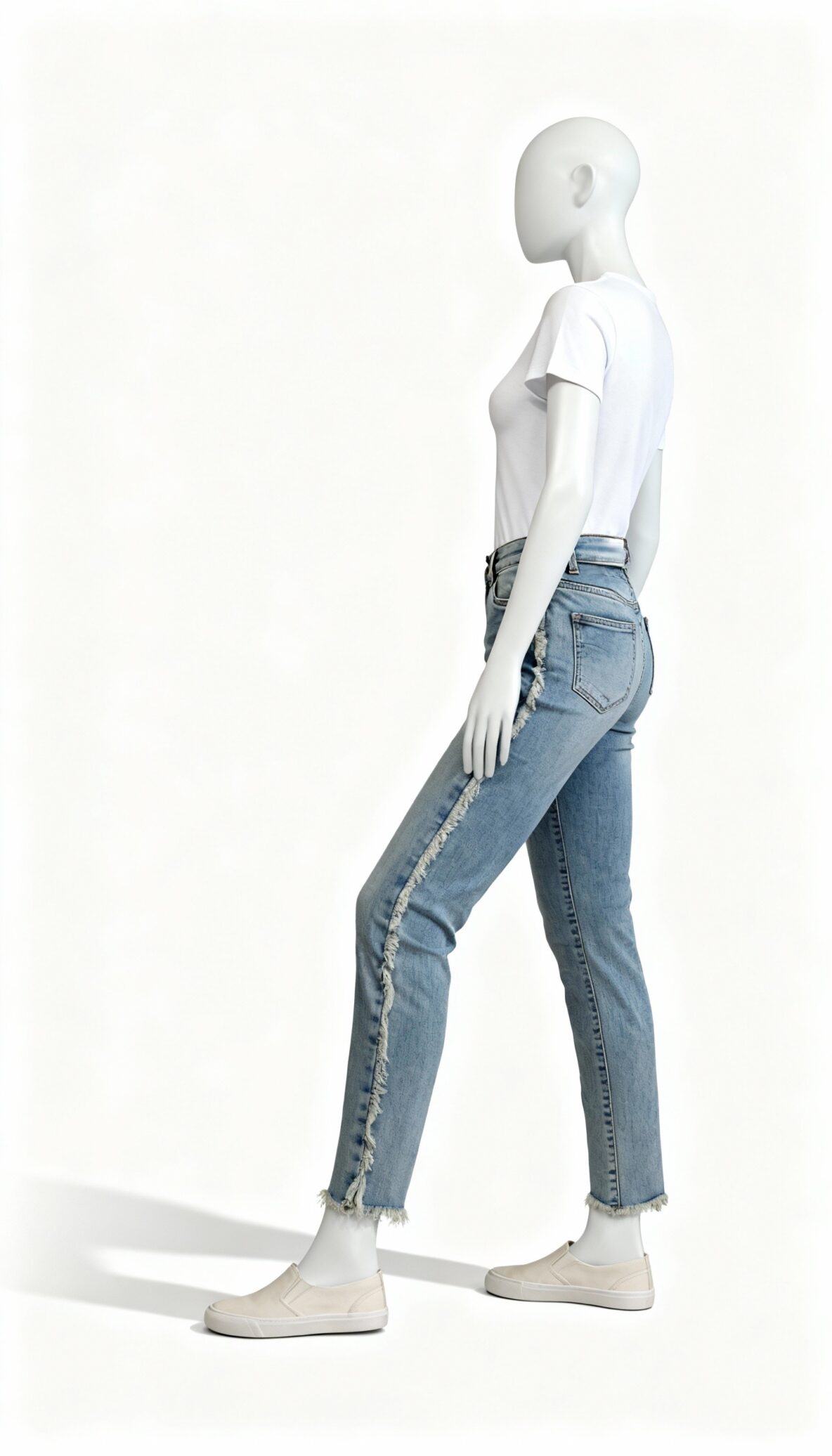 Light blue slim-fit denim jeans with raw edge side panels, a washed texture, and button-zip fastening.