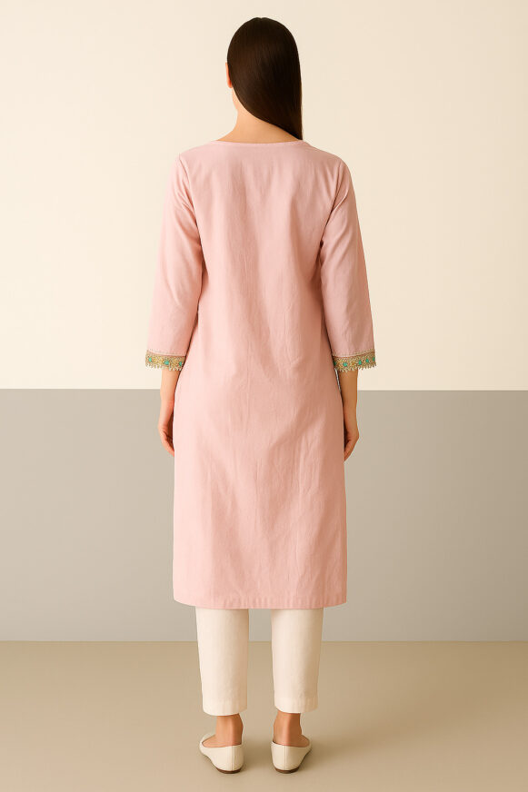 Pink Straight Kurta, Pastel pink straight kurta with embroidered lace sleeve detail, V-slit neckline, and modest side slits.