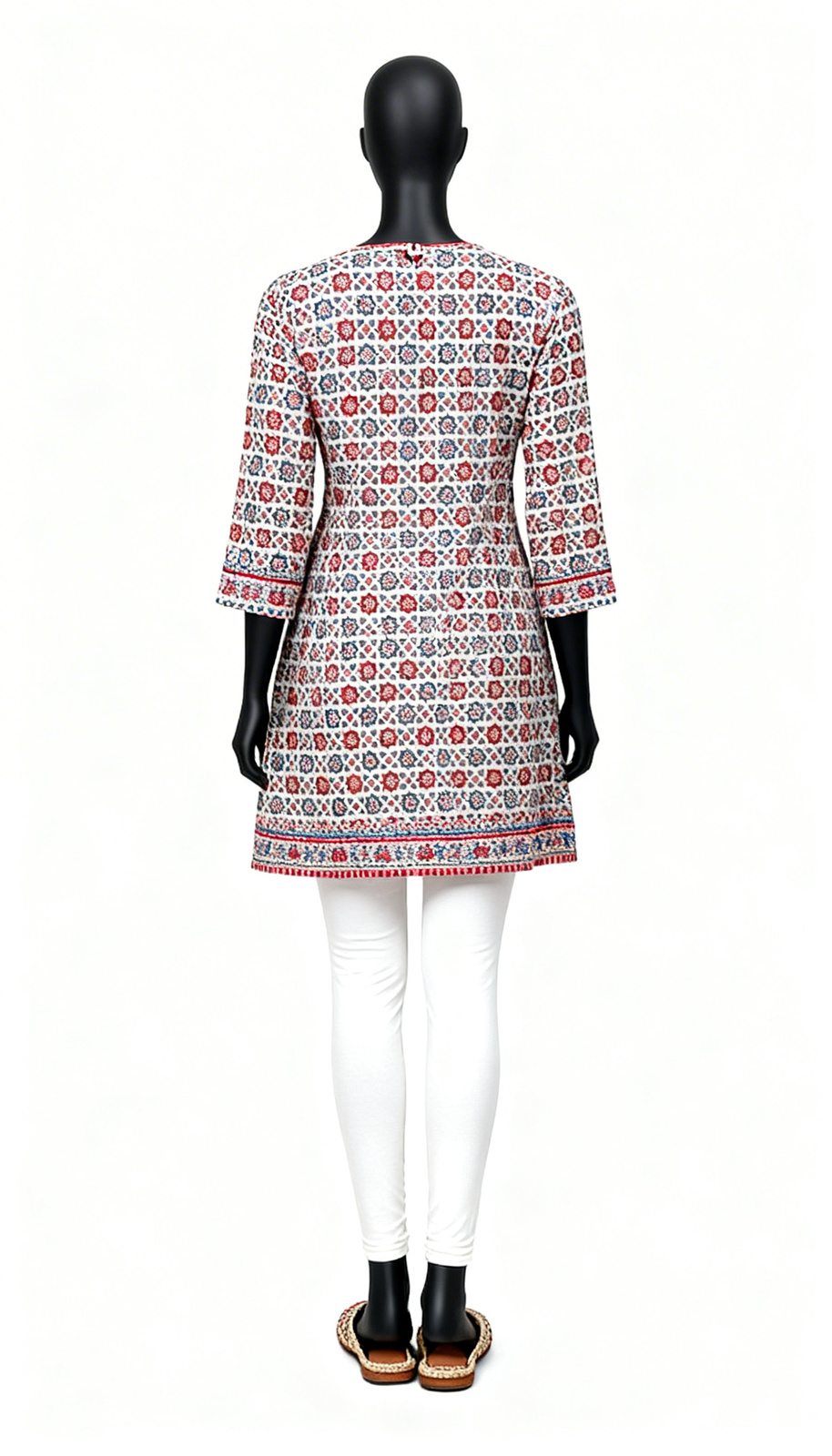 White Geometric Kurti features detailed printed cotton fabric with three fourth sleeves for formal office wear.
