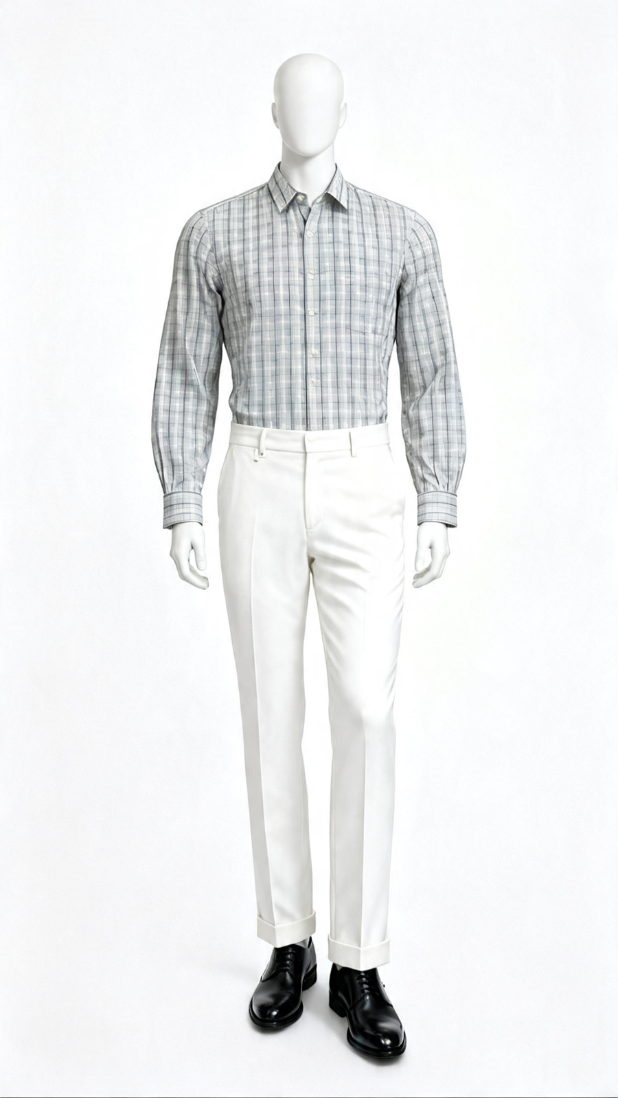 Light grey full-sleeve checkered shirt. This grey check formal shirt offers versatile styling, comfort, and repeat-wear value.
