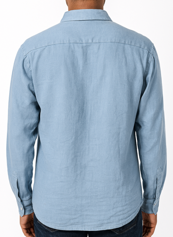 Men’s Light Blue Cotton Casual Shirt, Relaxed-fit sky blue cotton shirt with full sleeves, spread collar, and a single chest pocket. Features a plain back with a horizontal yoke and soft woven texture.
