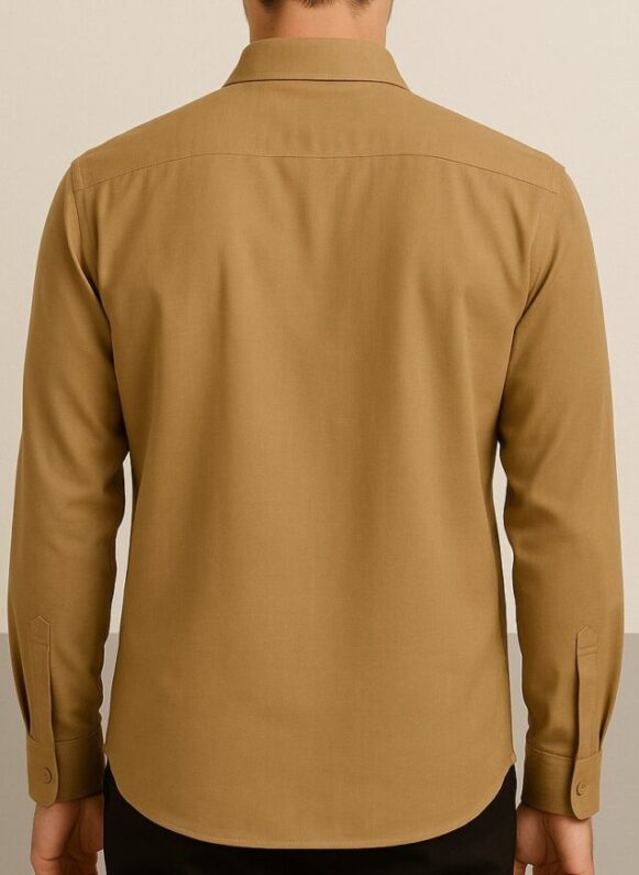 Men’s Camel Brown Cotton Solid Shirt, Camel brown formal cotton-blend shirt featuring full sleeves, buttoned cuffs, pointed collar, and chest pocket. Ideal for work or semi-formal wear.
