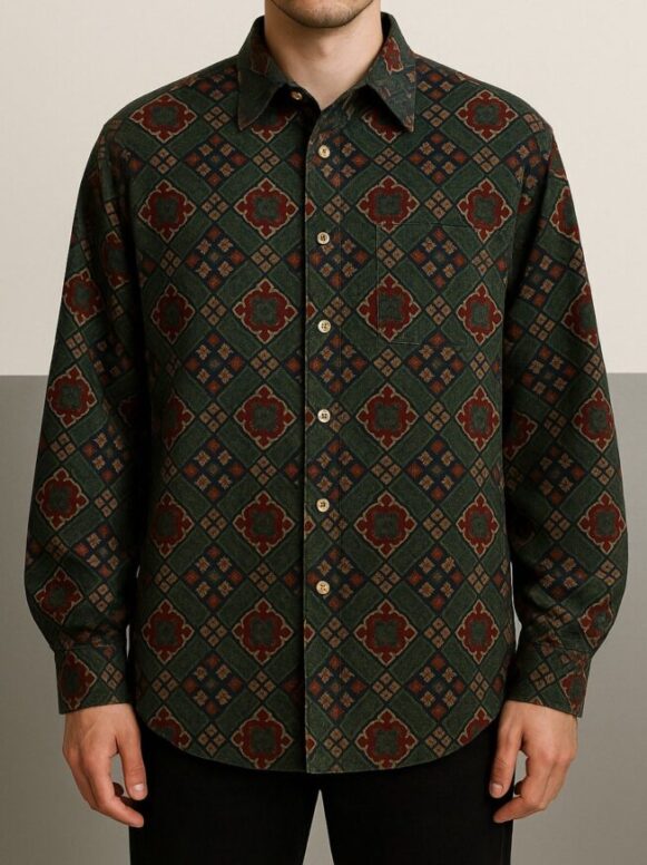 Men’s Green Geometric Print Shirt, Men's full-sleeve cotton shirt with vintage ethnic tile print in olive green and red. Features a chest pocket, button-down placket, and pleated back yoke.