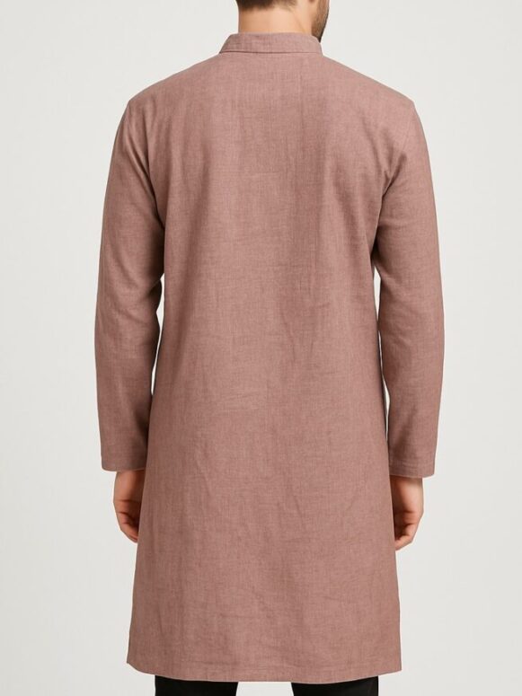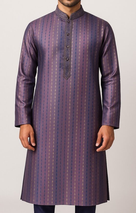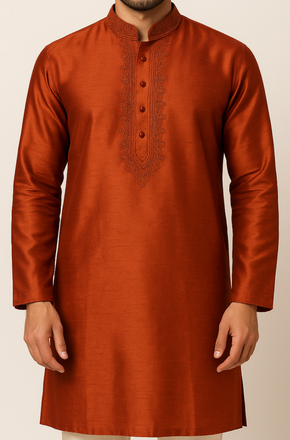 Rent for ₹100.00/day (Buy for ₹399.00)Rust Orange Men’s Textured Kurta, Rust orange straight-cut kurta in soft blended fabric with subtle vertical self-stripes, featuring a mandarin collar, half placket with matching buttons, and side slits. Designed with full sleeves and a clean back yoke for a versatile look, perfect for festive or casual wear.