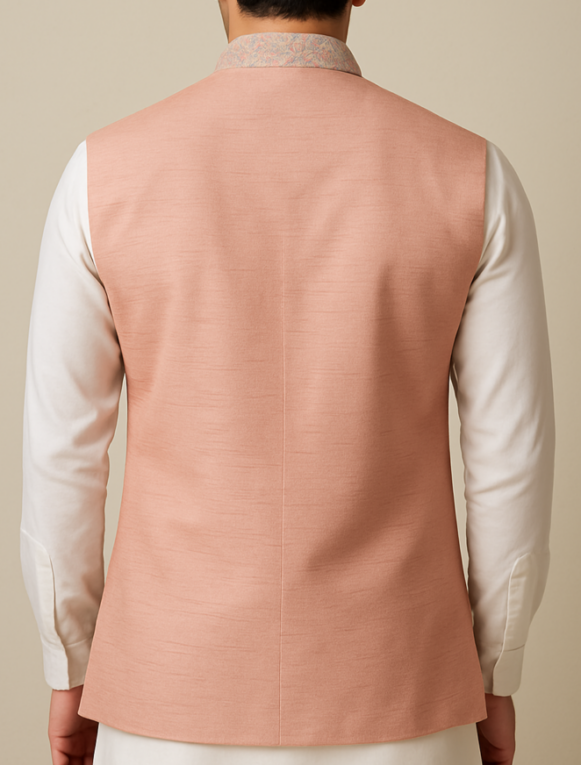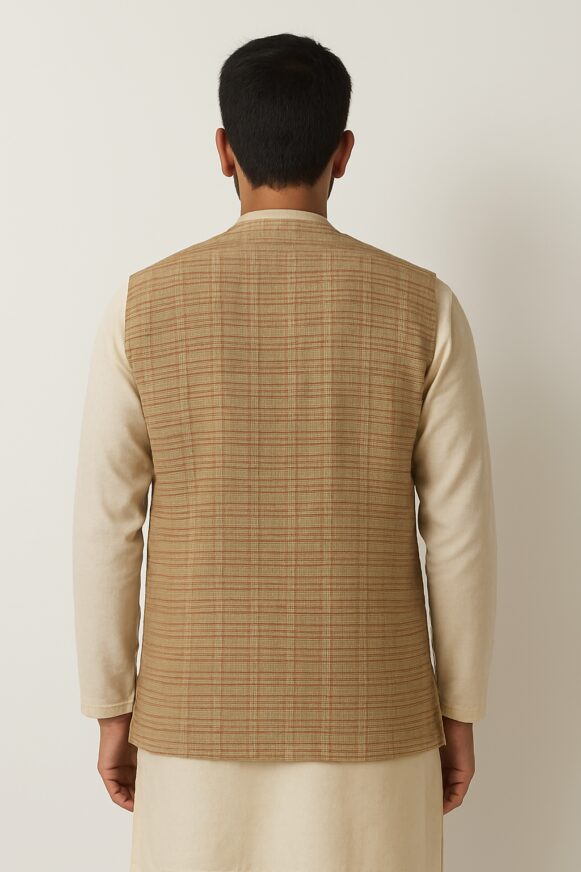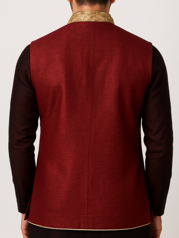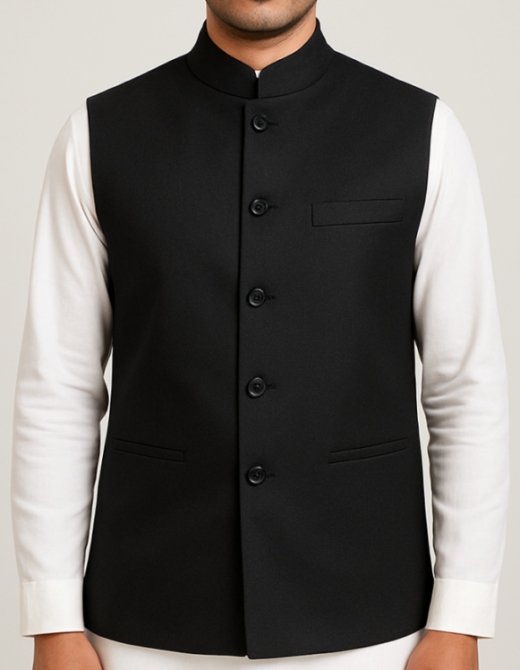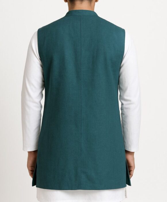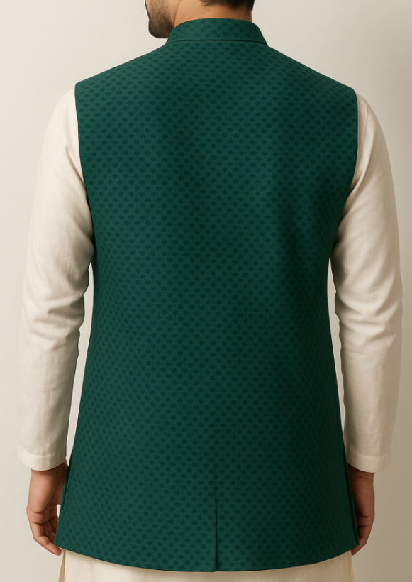 Rent for ₹60.00/day (Buy for ₹299.00)Dark Green Nehru Jacket, Dark green Nehru jacket with Mandarin collar, front buttons, and three welt pockets—ideal for festive and formal wear. Elevate your festive wardrobe with this Dark Green Nehru Jacket, a refined statement piece that blends traditional elegance with modern tailoring. Crafted to deliver a sharp, structured silhouette, this jacket sits cleanly on the shoulders and contours the torso for a polished, regal appearance. The deep green tone adds richness and sophistication, making it a standout choice for celebrations and formal occasions.