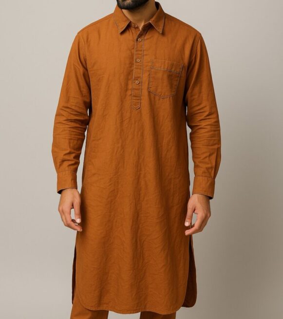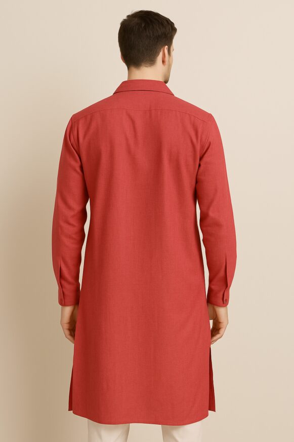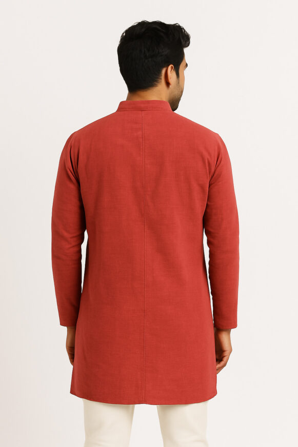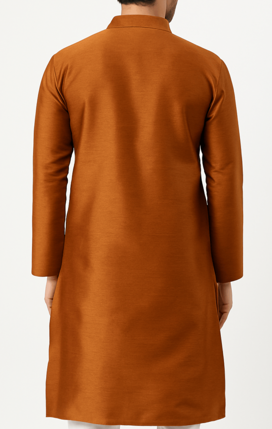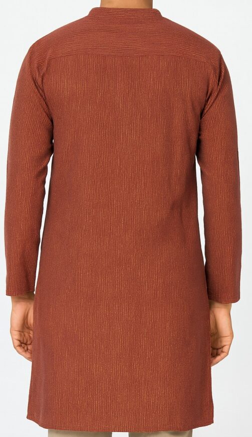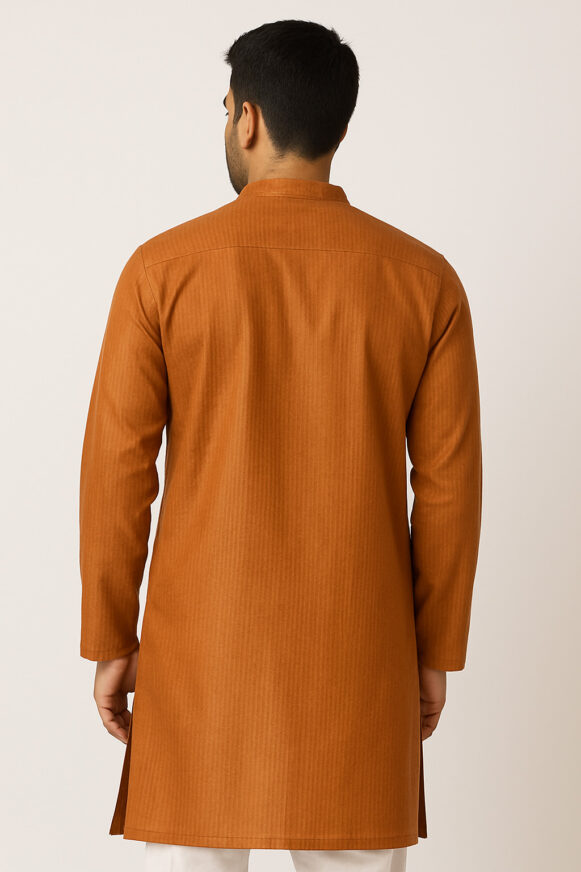 Rent for ₹100.00/day (Buy for ₹399.00)Rust Orange Men’s Textured Kurta, Rust orange straight-cut kurta in soft blended fabric with subtle vertical self-stripes, featuring a mandarin collar, half placket with matching buttons, and side slits. Designed with full sleeves and a clean back yoke for a versatile look, perfect for festive or casual wear.