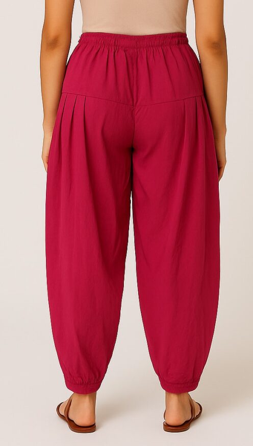 Magenta Harem Pants, Relaxed-fit magenta harem pants with pleats, elastic waist, adjustable tie, and ankle cuffs for stylish comfort.