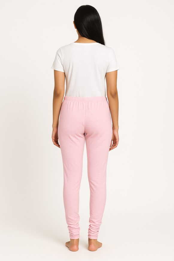Light Pink Churidar Leggings, Light pink cotton churidar leggings with white tee – breathable, stretch-friendly, and stylish for all-day wear.