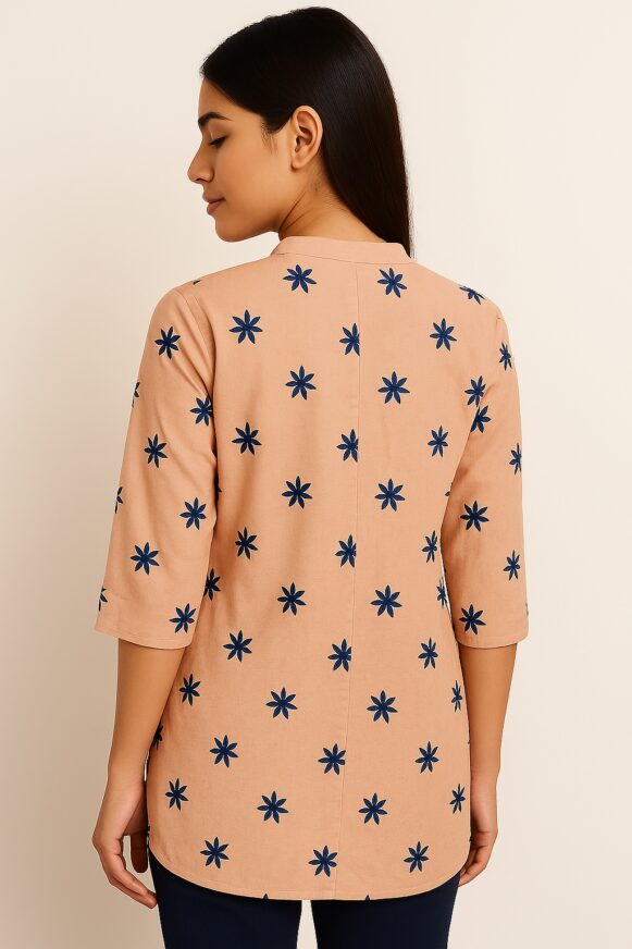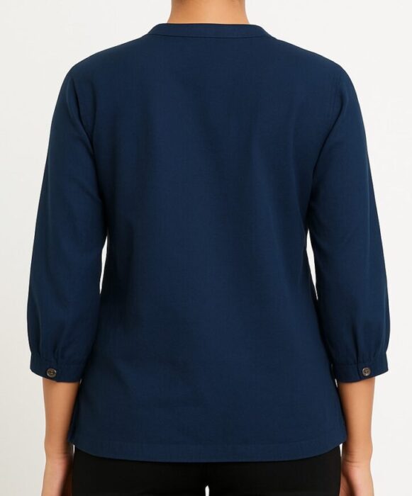 Navy Blue Kurti Top, Navy blue cotton kurti top with mandarin neckline, wooden-look button placket, embroidered detailing, and 3/4 sleeves for versatile styling.