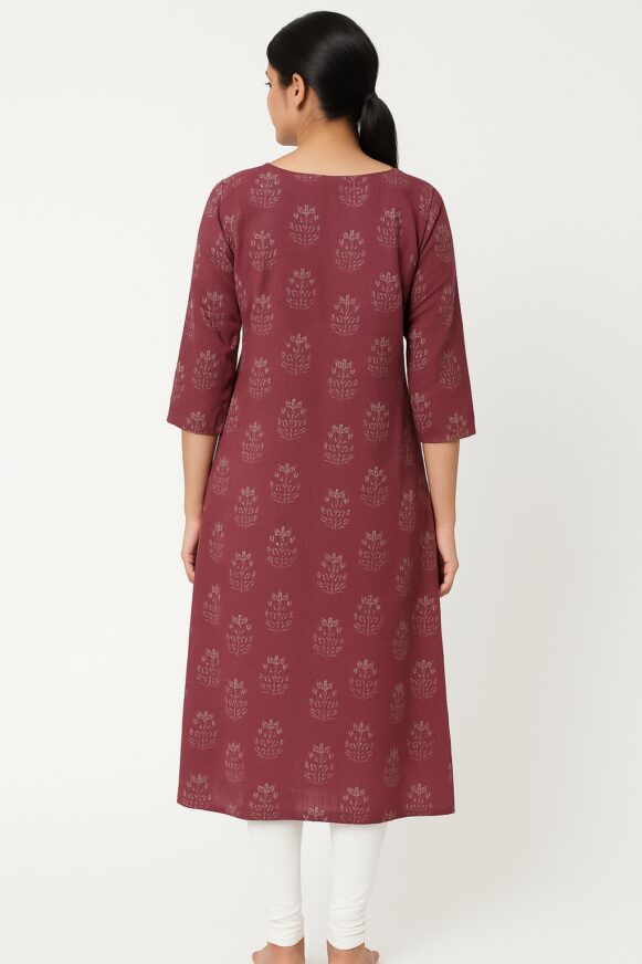 Maroon Zip-Front Printed Kurti, Maroon cotton kurti with beige floral print, zip neckline, 3/4th sleeves, and side slits. Ideal for daily ethnic styling.