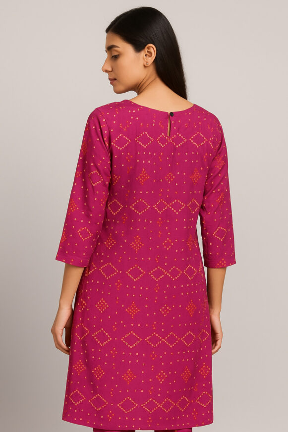 Magenta Printed Straight Kurti, Magenta straight-fit kurta with all-over traditional print, round neckline, 3/4 sleeves, and back button closure. Made for style and comfort.