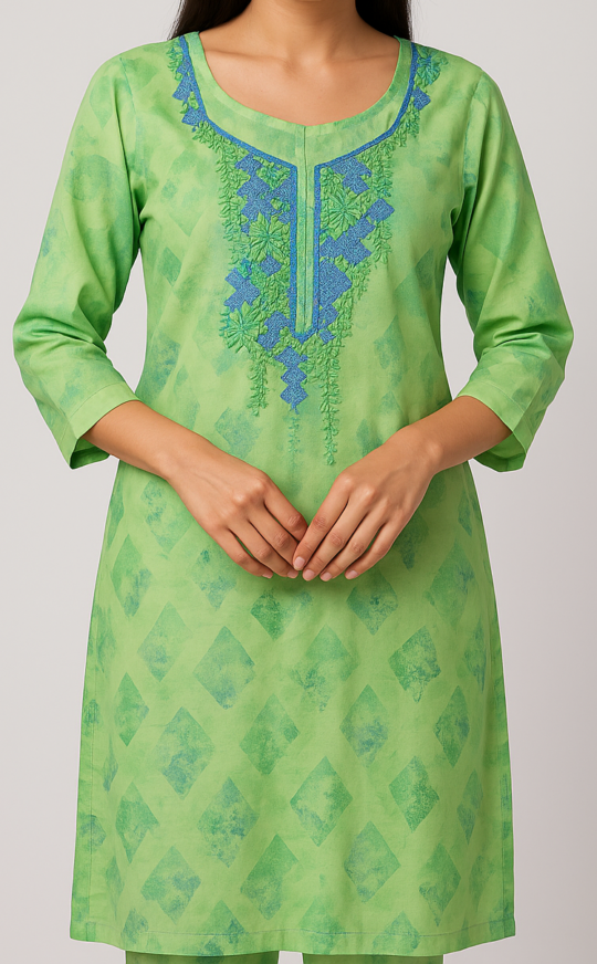 Lime Green Kurti, Lime green cotton kurta with subtle diamond prints and blue embroidered neckline, featuring 3/4th sleeves and a straight comfortable fit.