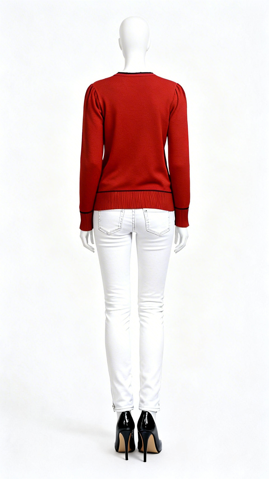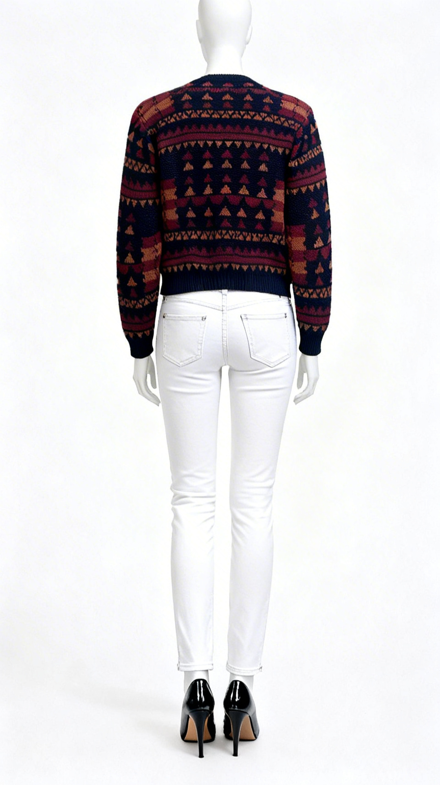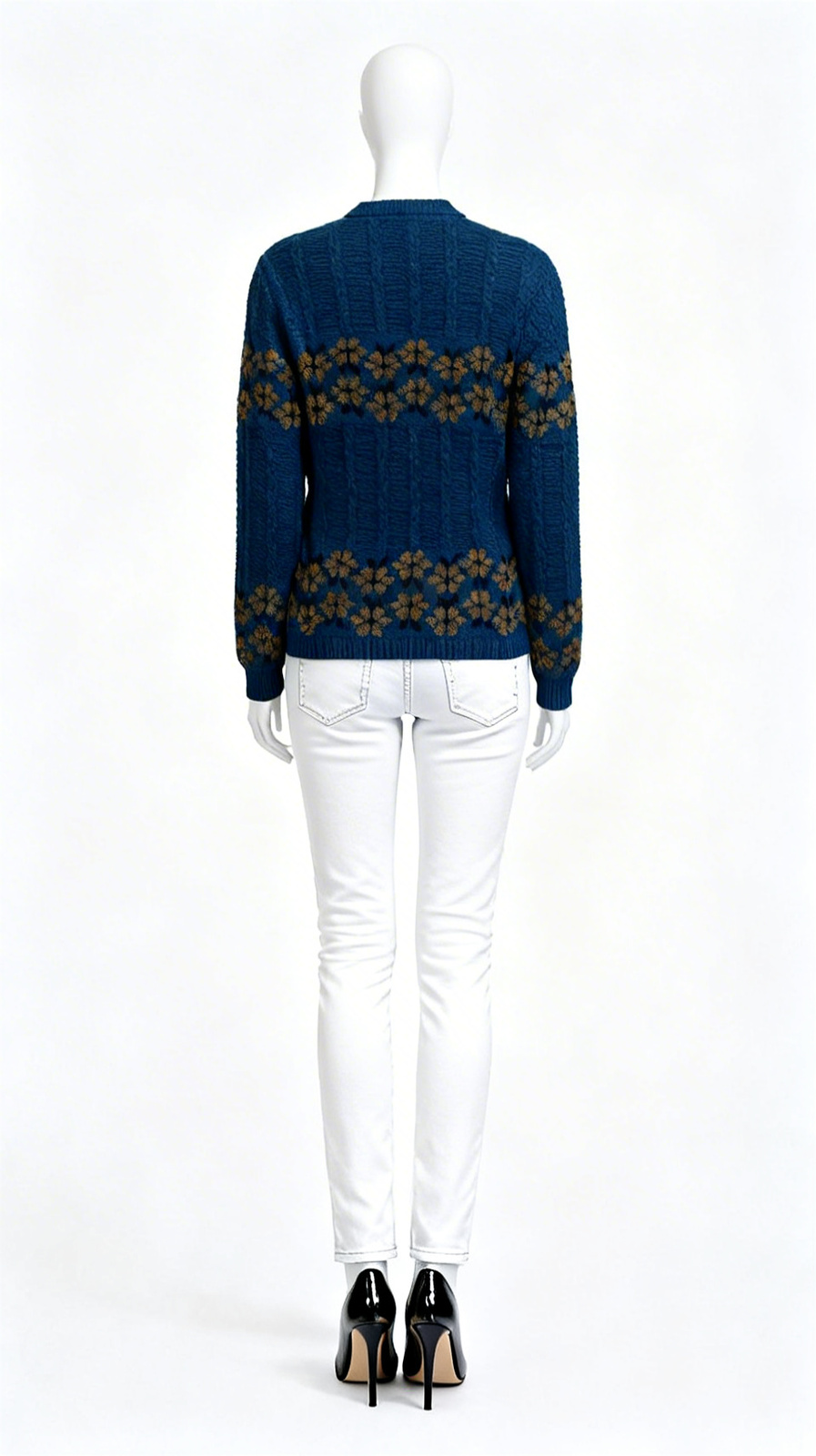Navy blue striped sweater with ivory horizontal lines, round neckline, long sleeves, and green hem detail. Stylish, comfortable, and easy to pair with jeans or trousers.