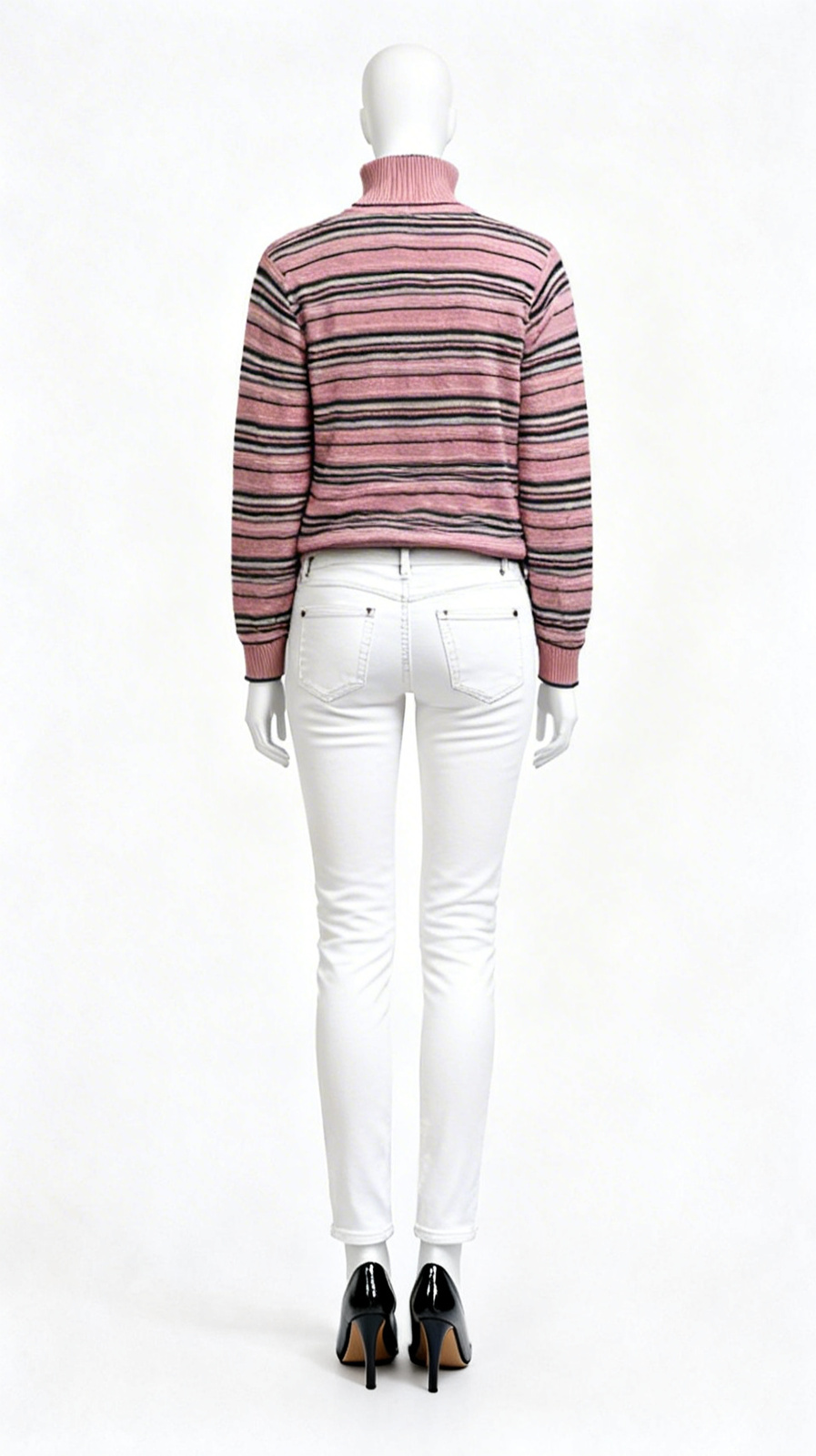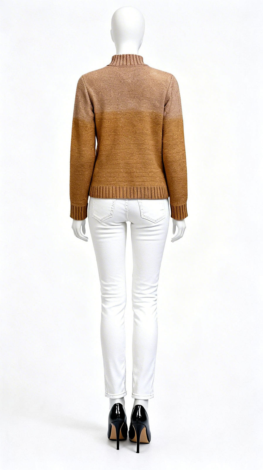 A modern women’s colorblock sweater featuring beige, brown, and pink tones with a round neckline and ribbed detailing. Comfortable knit ideal for casual wear.