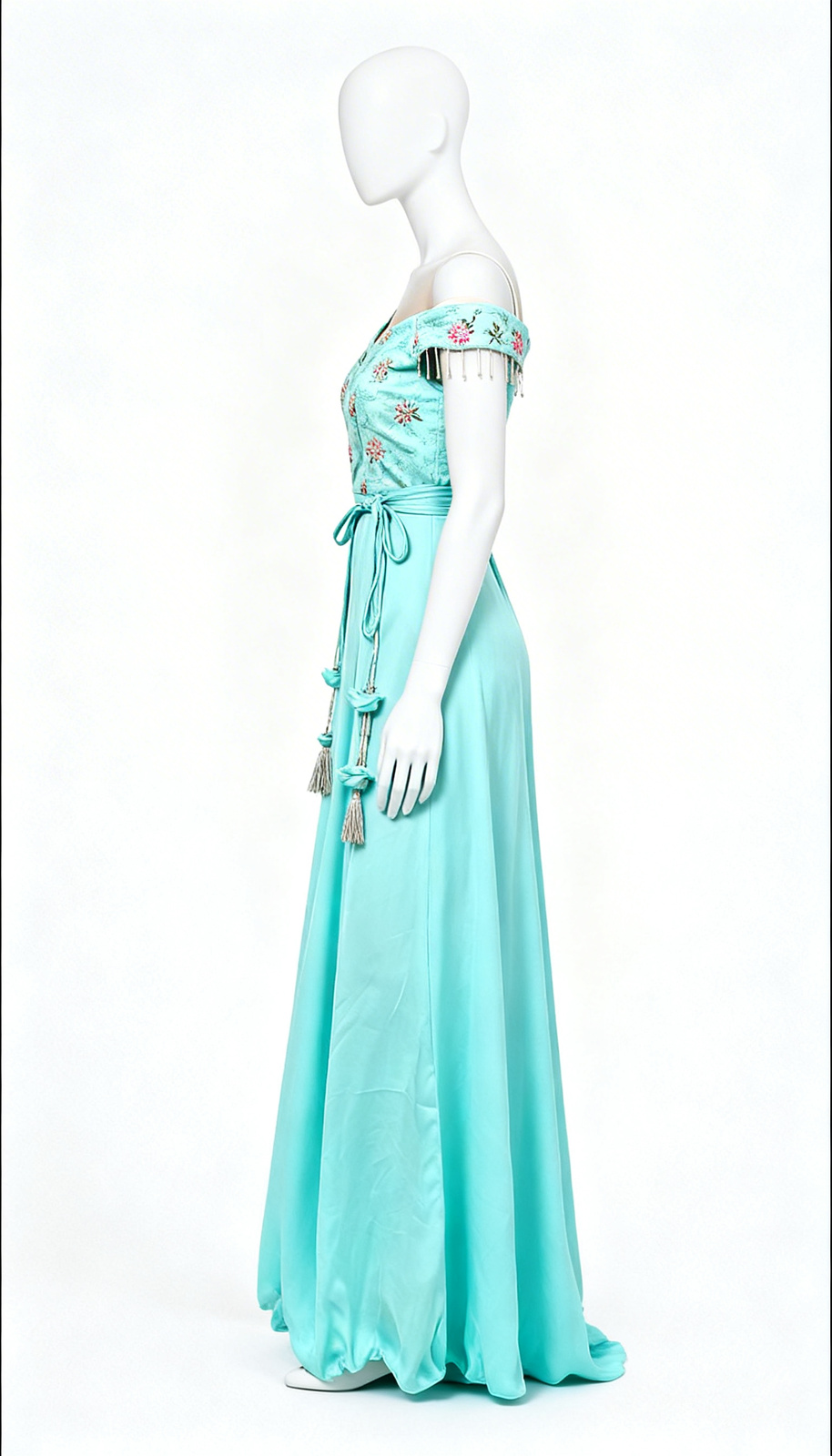 Mint Green Ethnic Western Dress, Turquoise Embellished Off Shoulder Flared Maxi Dress bringing soft glamour to festive gatherings.