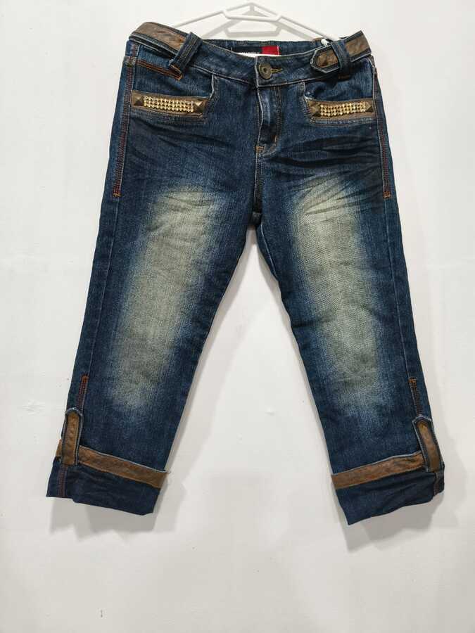Stylish blue distressed denim jeans featuring embellished pockets, roll-up hems and a comfortable mid-rise fit for casual wear.
