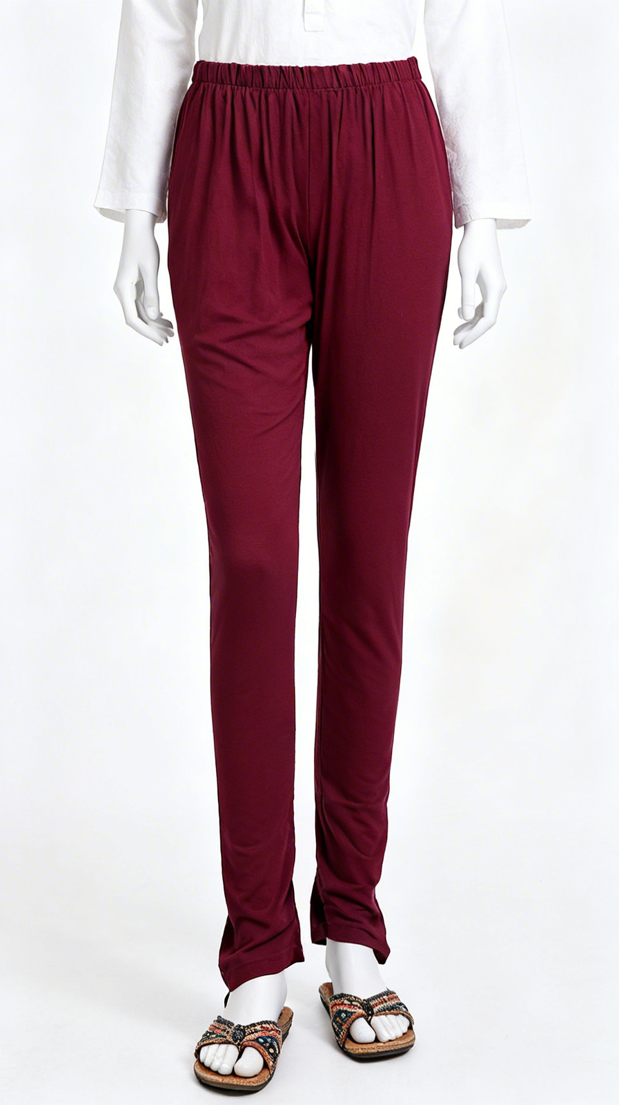 Comfortable stretchable maroon leggings featuring soft breathable fabric and elastic waistband, perfect for daily wear styling.