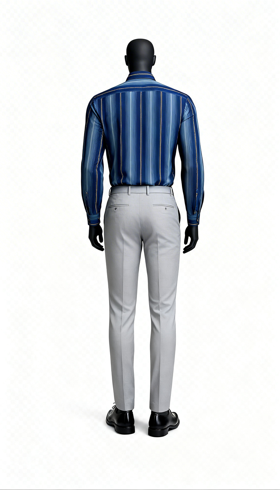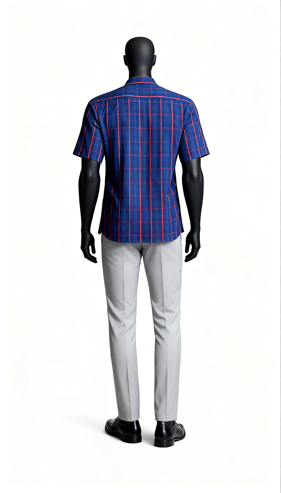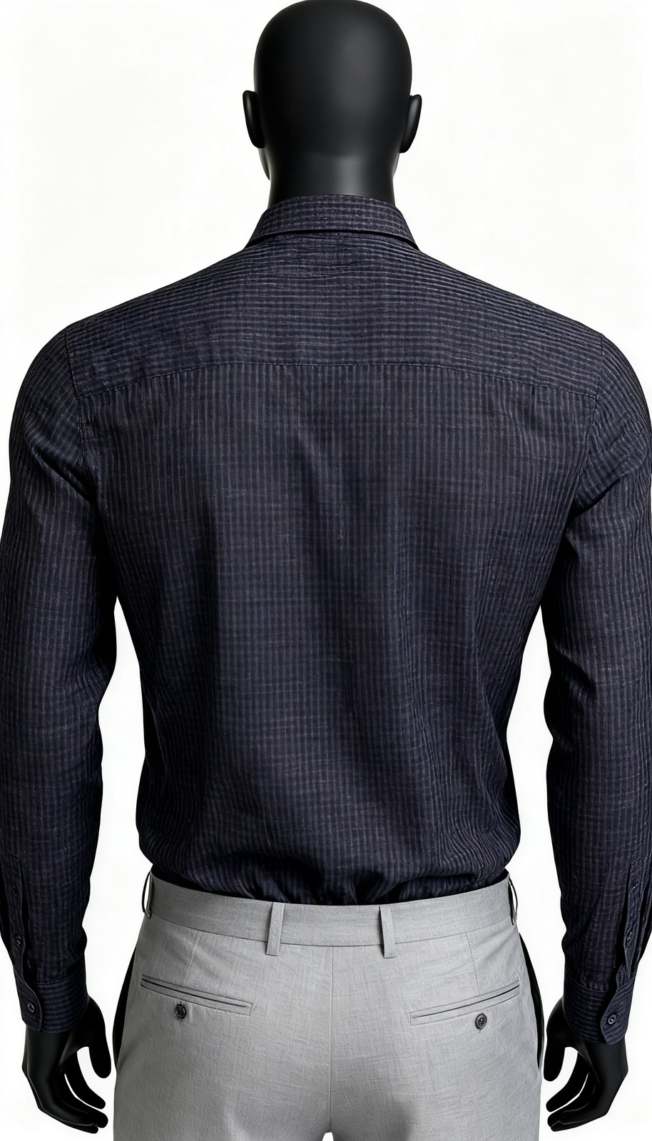 Rent for ₹70.00/day (Buy for ₹349.00)Refined navy blue cotton kurta featuring subtle beige vertical pinstripes, a band collar, half placket with wooden buttons, and three-quarter sleeves. Designed in a relaxed straight fit with calf-length fall, it offers breathable comfort—ideal for workwear or casual gatherings.