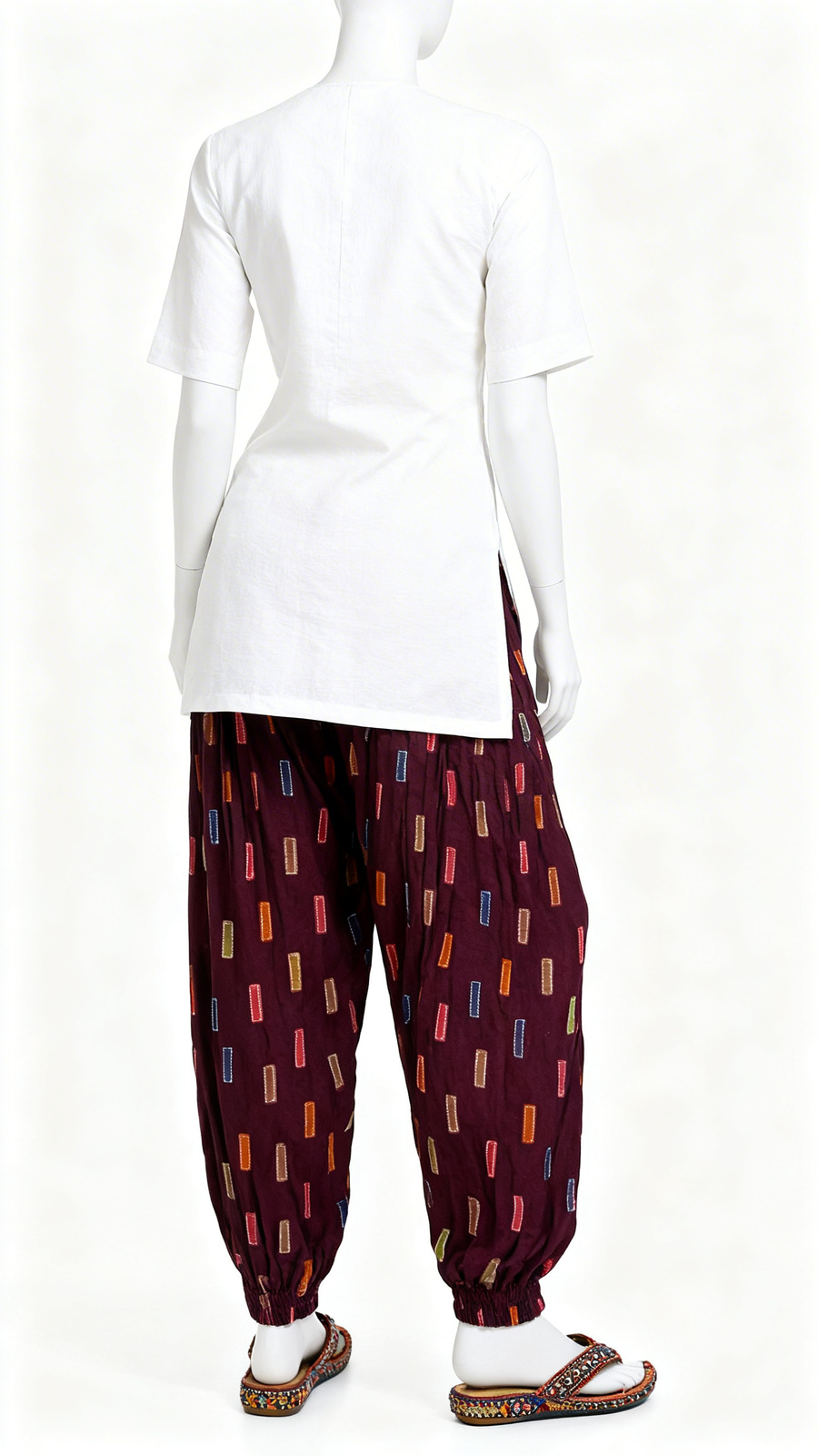 Comfortable maroon Patiala pant with colorful stitched pattern design, soft breathable fabric and elastic waistband for daily wear.