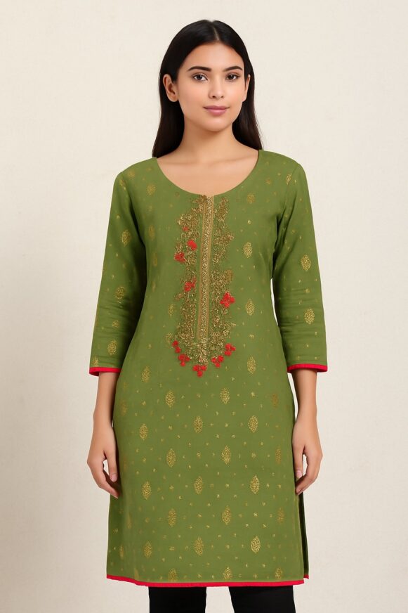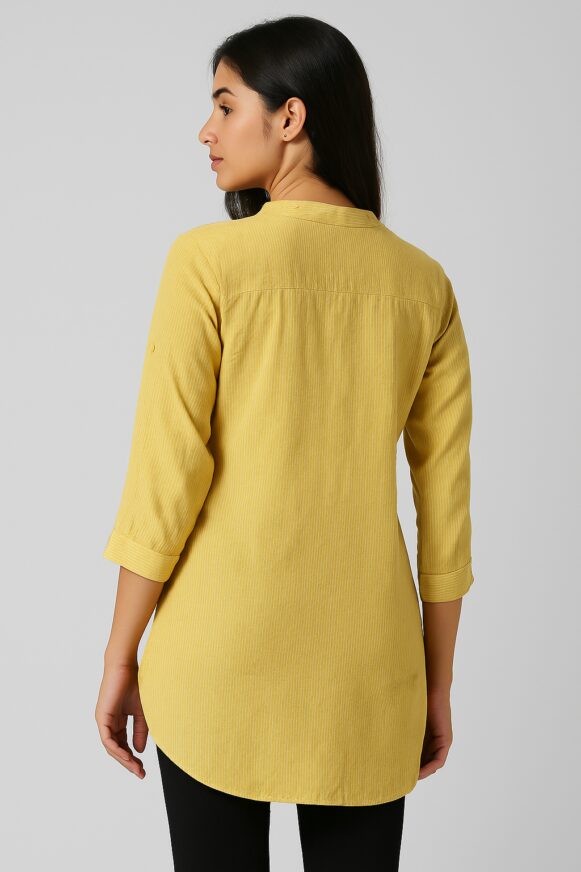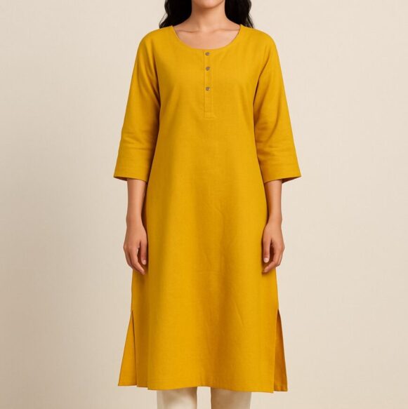 Rent for ₹70.00/day (Buy for ₹349.00)Refined navy blue cotton kurta featuring subtle beige vertical pinstripes, a band collar, half placket with wooden buttons, and three-quarter sleeves. Designed in a relaxed straight fit with calf-length fall, it offers breathable comfort—ideal for workwear or casual gatherings.