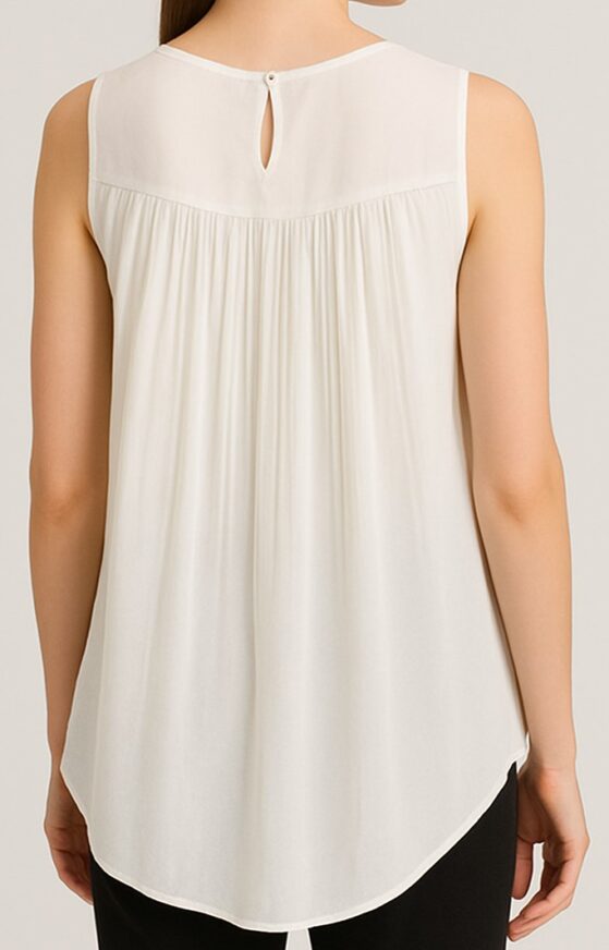 Women’s White Sleeveless Pleated Top, Ivory sleeveless top with front pleats, asymmetrical hem, and back keyhole closure in lightweight chiffon.