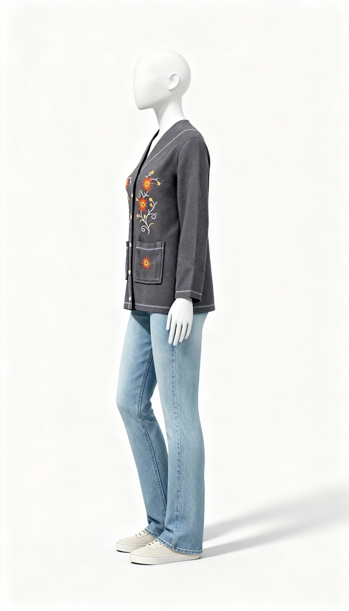 Grey Floral Embroidered Winter Button-Down Jacket, A cosy charcoal grey fleece jacket with beautiful floral embroidery, full sleeves, and a button-down front—perfect for everyday winter comfort.