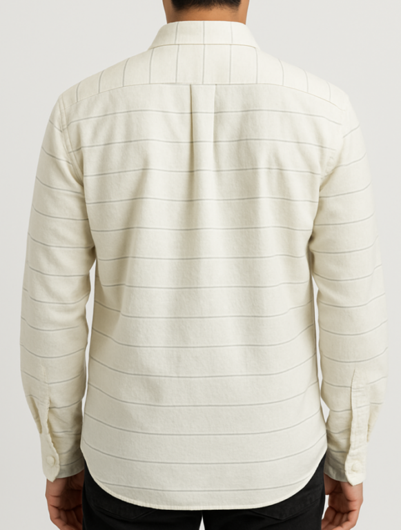 Rent for ₹50.00/day (Buy for ₹149.00)Off-White Stripe Casual Shirt, Men’s off-white full-sleeve shirt with horizontal stripes and chest pocket, tailored for a relaxed fit. The off-white base creates a fresh, versatile foundation, while horizontal stripes introduce a subtle graphic element that adds personality without overwhelming the look. A neatly placed chest pocket enhances both style and practicality, giving the shirt a balanced, laid-back appeal. The combination of stripes and neutral tones makes it easy to pair with denim, chinos, or tailored trousers for a smart casual finish.