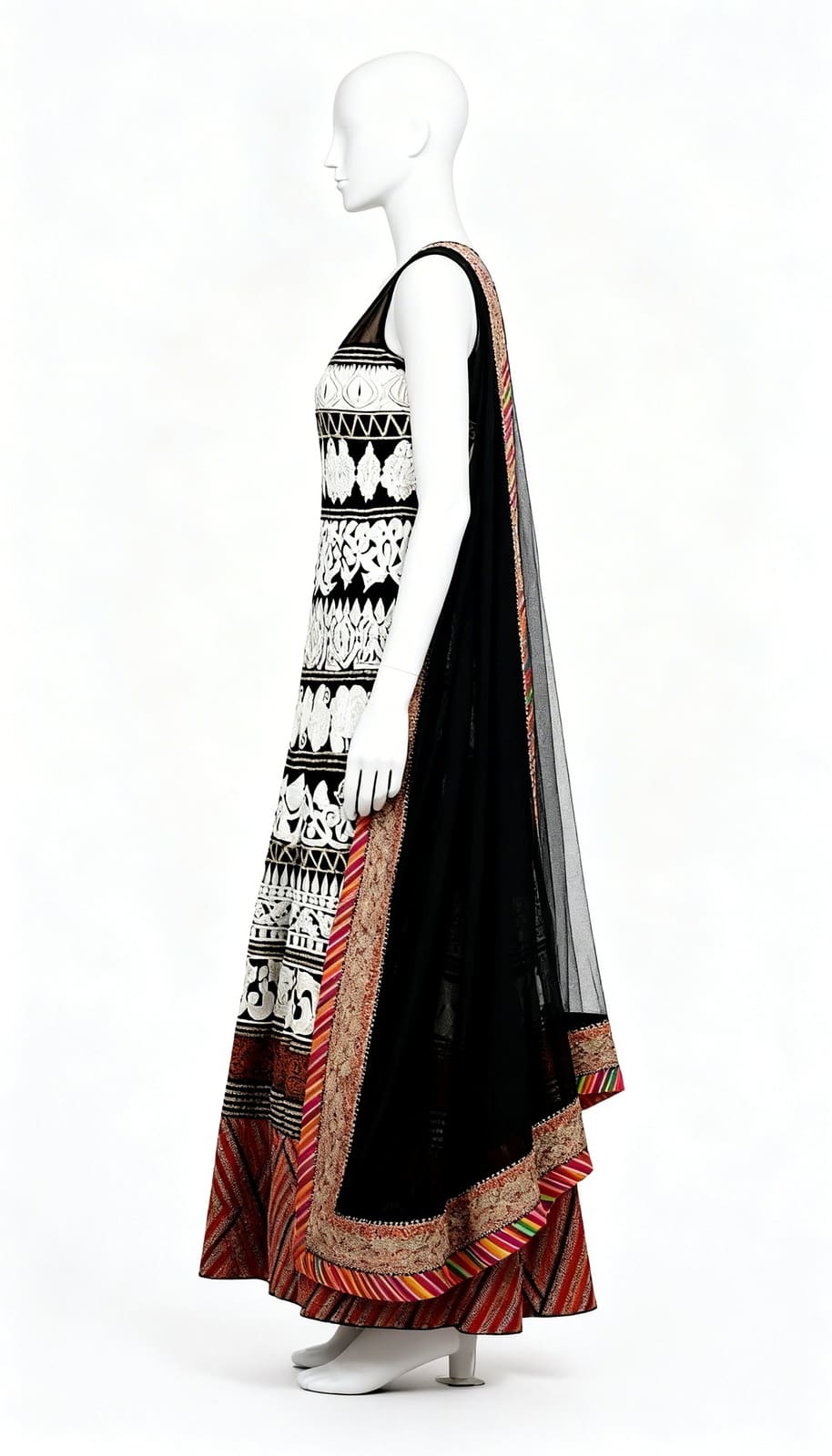 Fully embroidered in thread. Bottom with colourful border. Deep back. Black dupatta with colourful border. Padded. See size chart for length and fit. About the designer: The label caters to the taste for antiques, the designs are inspired from the vintage traditions of India.