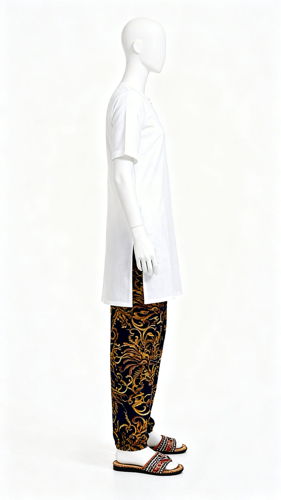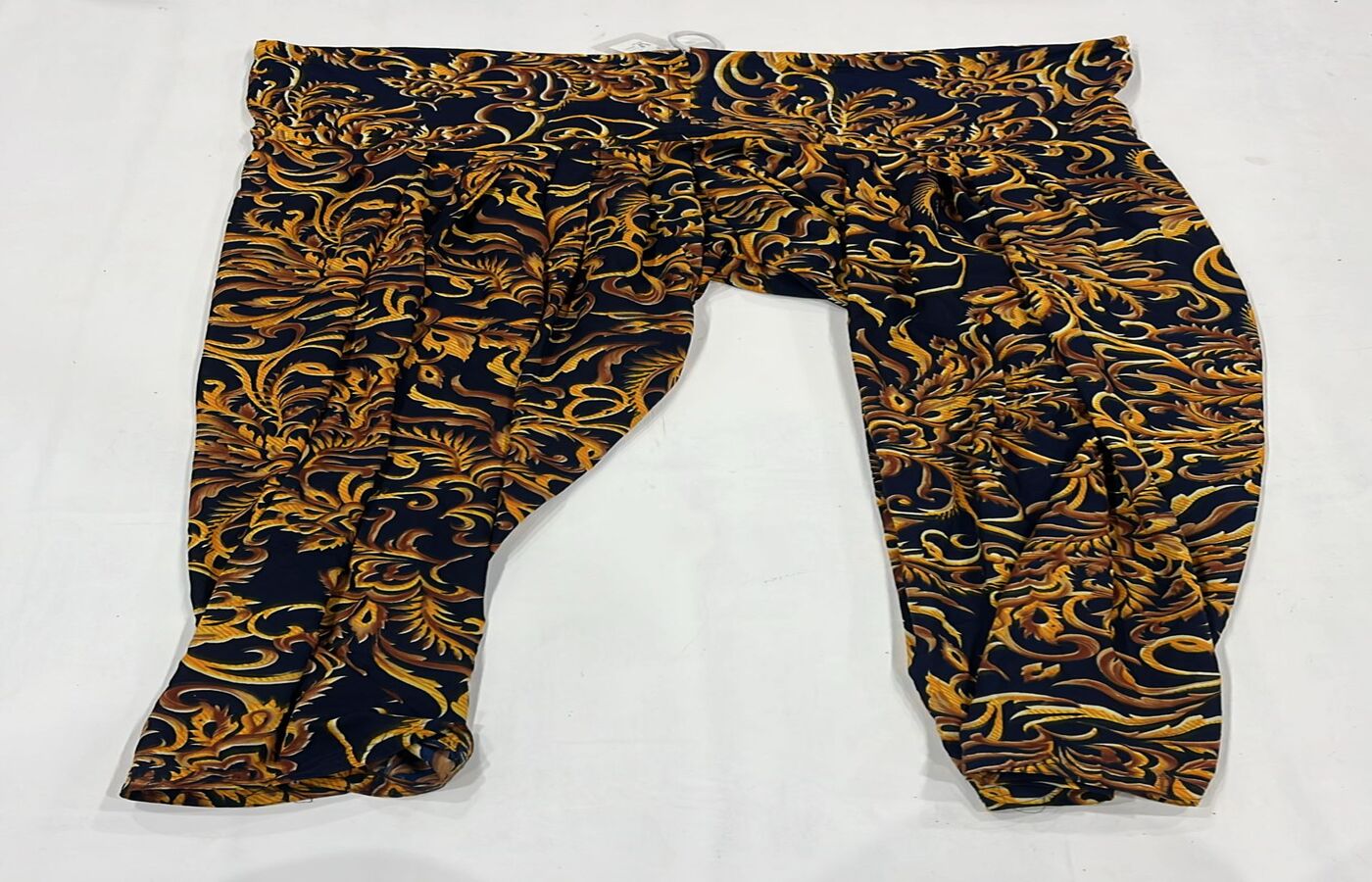 These black and gold printed dhoti pants feature an elegant baroque-style pattern with a soft draped silhouette for standout festive styling. Crafted from lightweight breathable fabric, offering a comfortable relaxed fit ideal for weddings, stage performances or Indo-western fusion outfits. Pair with solid kurtas or designer tops for a bold statement look.