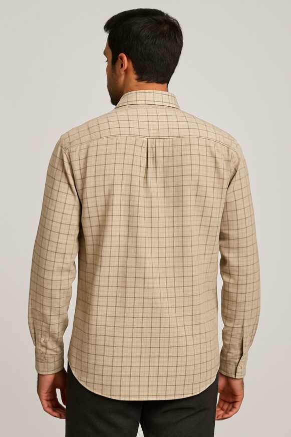 This men's beige checked shirt is crafted from soft cotton fabric, designed for all-day comfort and effortless style. It features a pointed collar, full front button placket, and a single chest pocket for functionality. The muted beige base is accentuated with fine brown checks, giving it a refined, classic appeal. The shirt is tailored in a regular fit with full sleeves and a rounded hem, suitable for both formal and casual settings. The back is clean with a central box pleat for added flexibility.