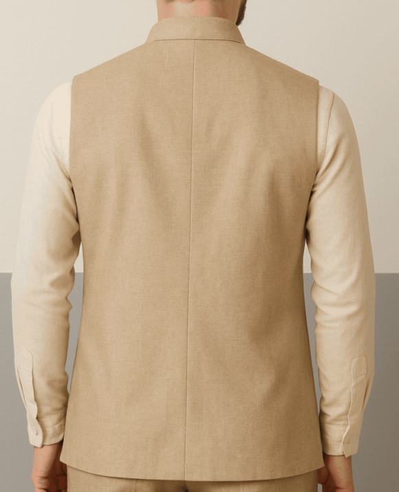 This classic beige Nehru jacket features a structured mandarin collar, five-button front placket, and three front welt pockets — including one chest pocket. Crafted from a fine textured fabric in a neutral beige tone, it offers both sophistication and comfort. The back panel is clean with a center seam, giving a sharp and tailored silhouette ideal for formal or semi-formal occasions. Pair it with a kurta, shirt, or formal trousers for a versatile ethnic-meets-modern look.
