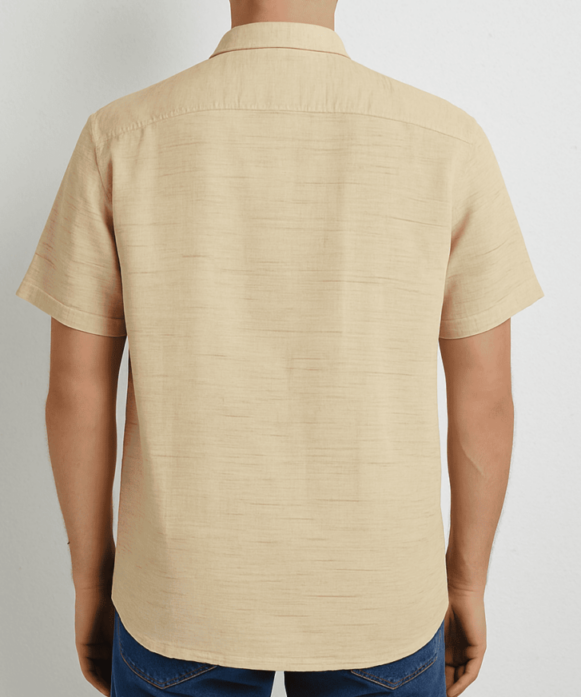 Beige Cotton Shirt, A classic men's short sleeve shirt made from soft, breathable cotton in a light beige hue. Designed for casual sophistication, this shirt features a subtle slub texture throughout, a pointed collar, a front button placket with matching beige buttons, and a single chest pocket. The shirt is tailored in a regular fit with a slightly curved hemline and a back yoke for a clean finish.