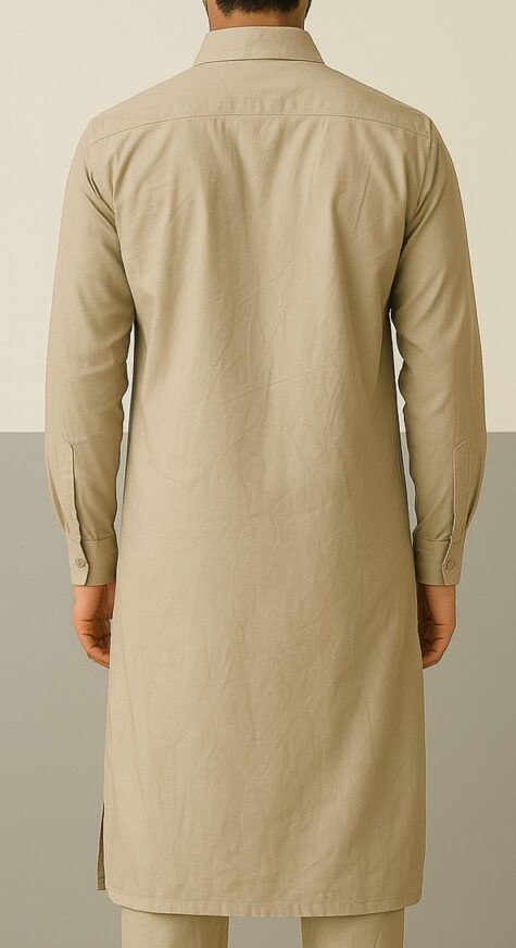 This men’s classic kurta pajama set in an elegant beige tone is crafted from premium cotton-blend fabric, offering all-day comfort with a crisp look. The kurta features a sharp shirt collar, half-button placket, and a single front pocket, giving it a refined touch. The straight-cut silhouette with side slits ensures ease of movement, while the full sleeves and buttoned cuffs add structure. The matching pajama complements the kurta perfectly, making this set ideal for festive gatherings, formal functions, or traditional occasions.